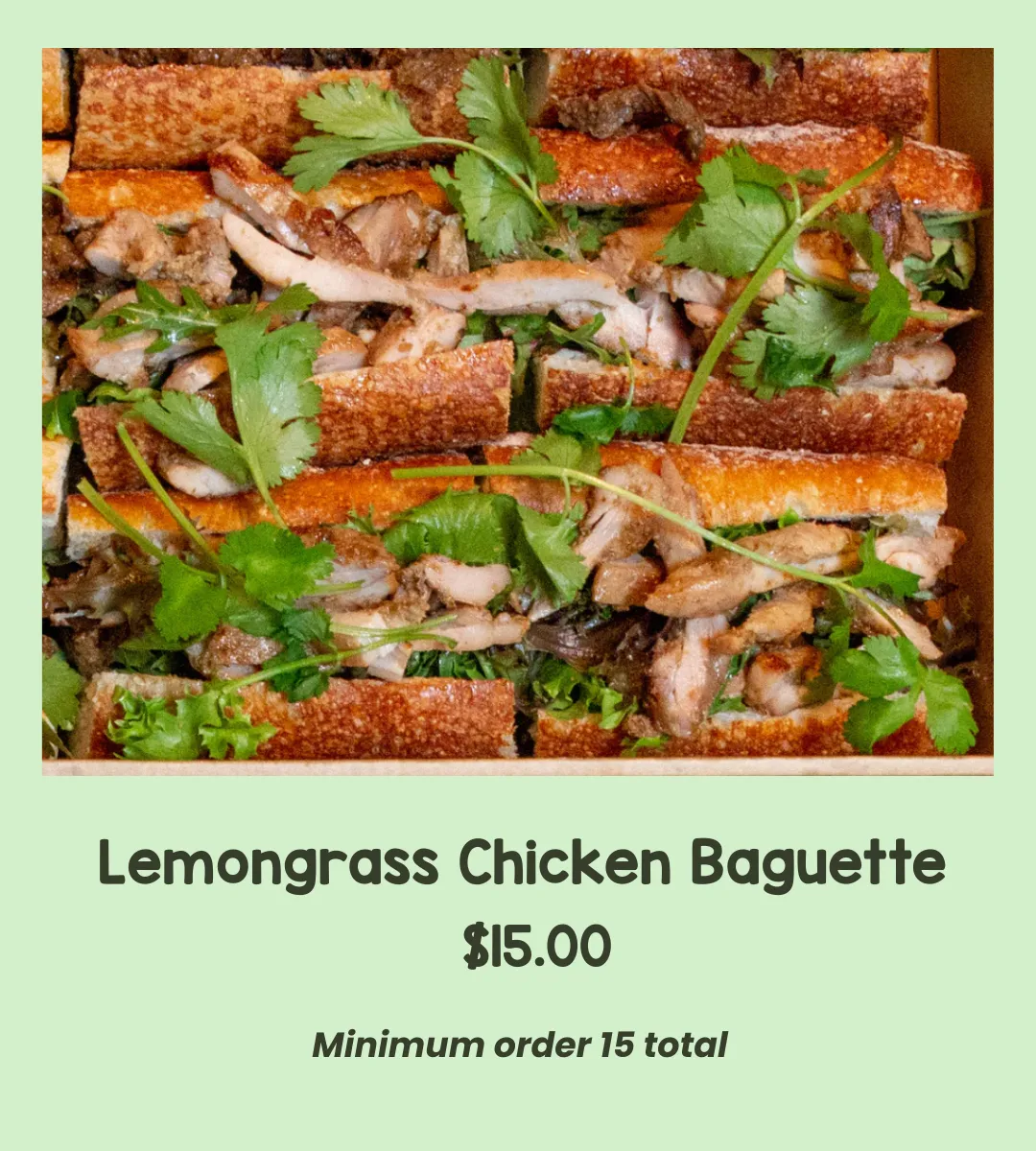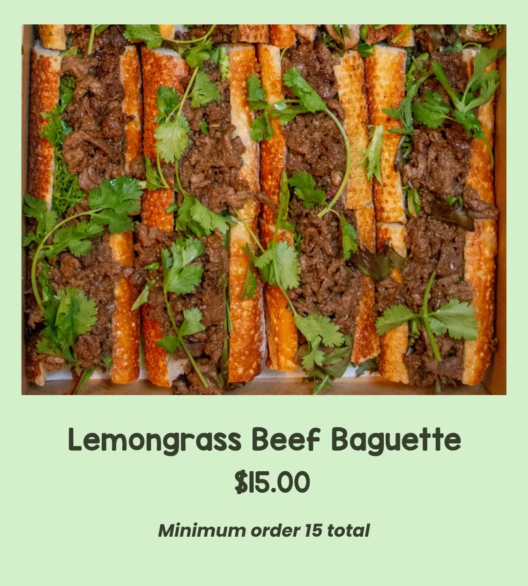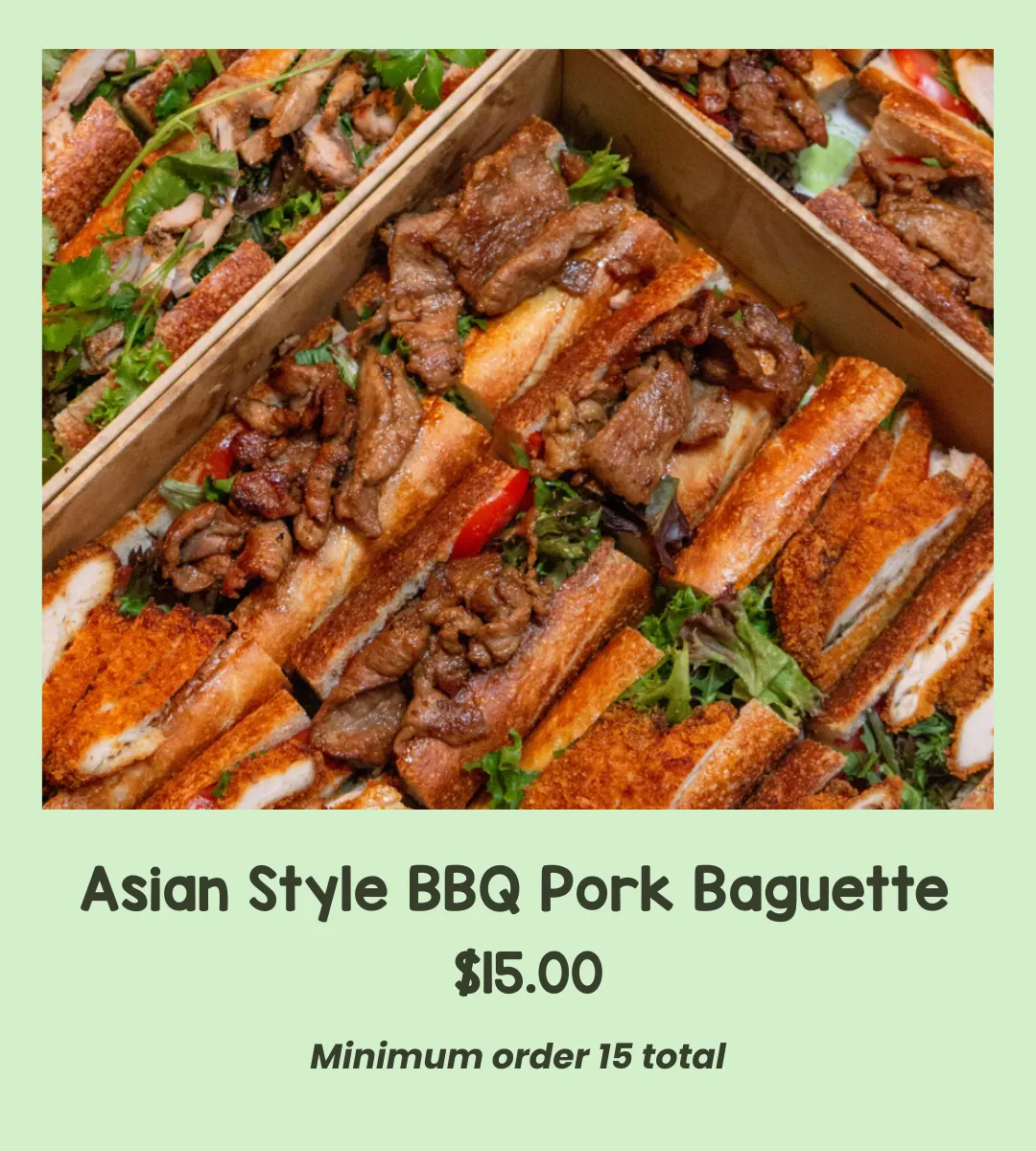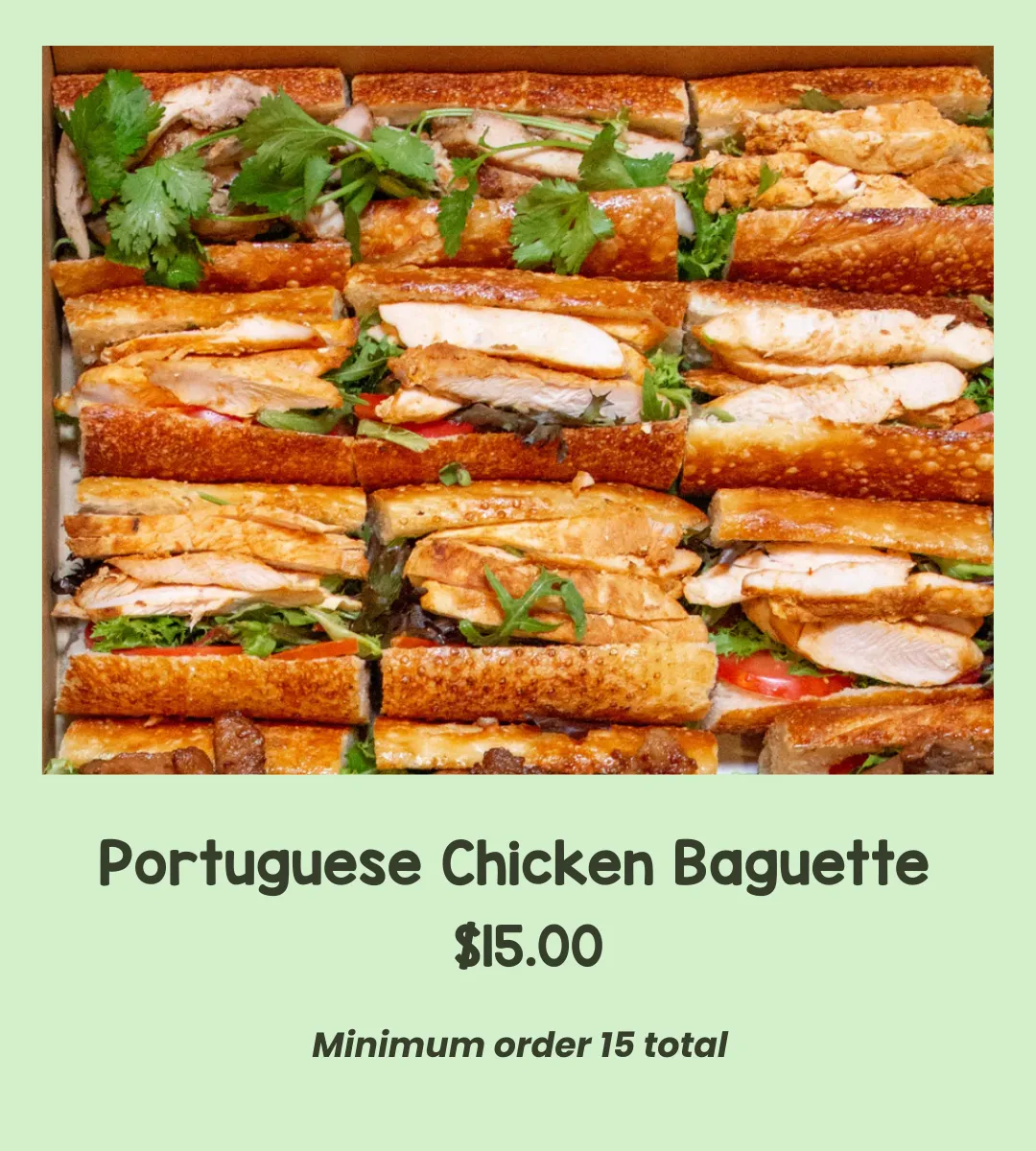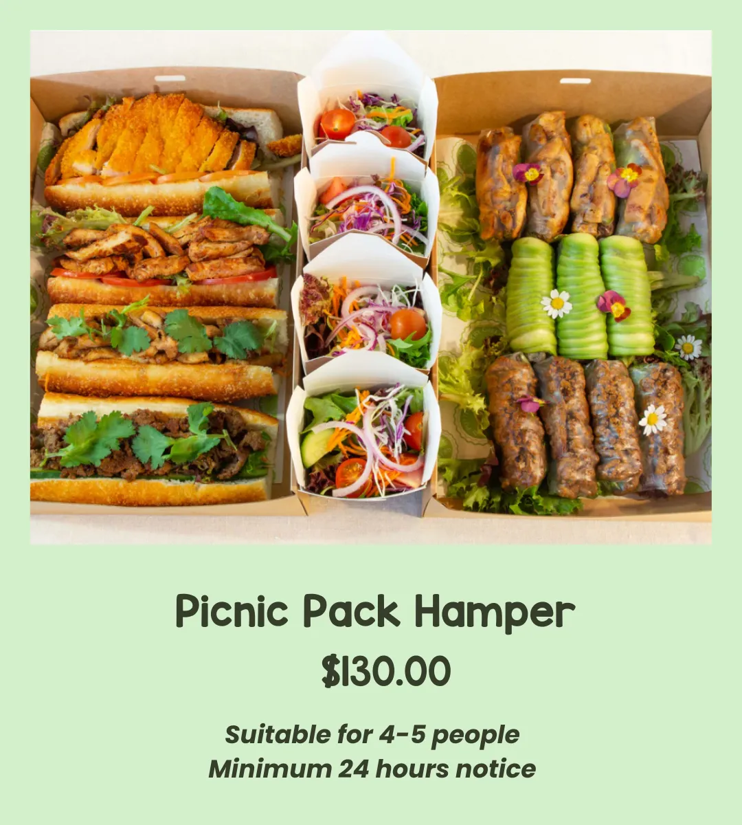 From lemongrass chicken and beef baguettes and pork rolls to fresh pastries, breakfast hampers, and picnic packs, our tailored catering options are designed to delight everyone.